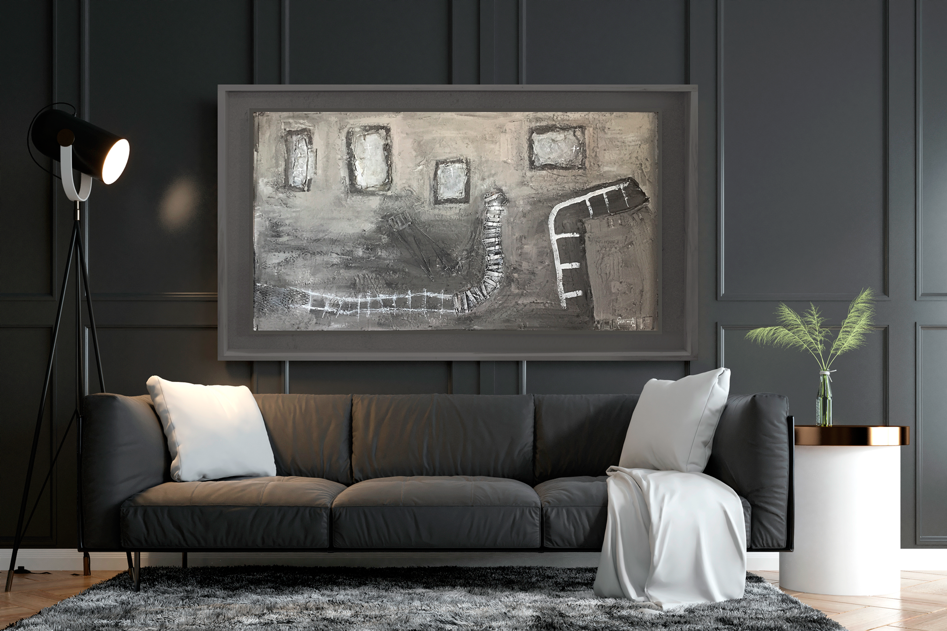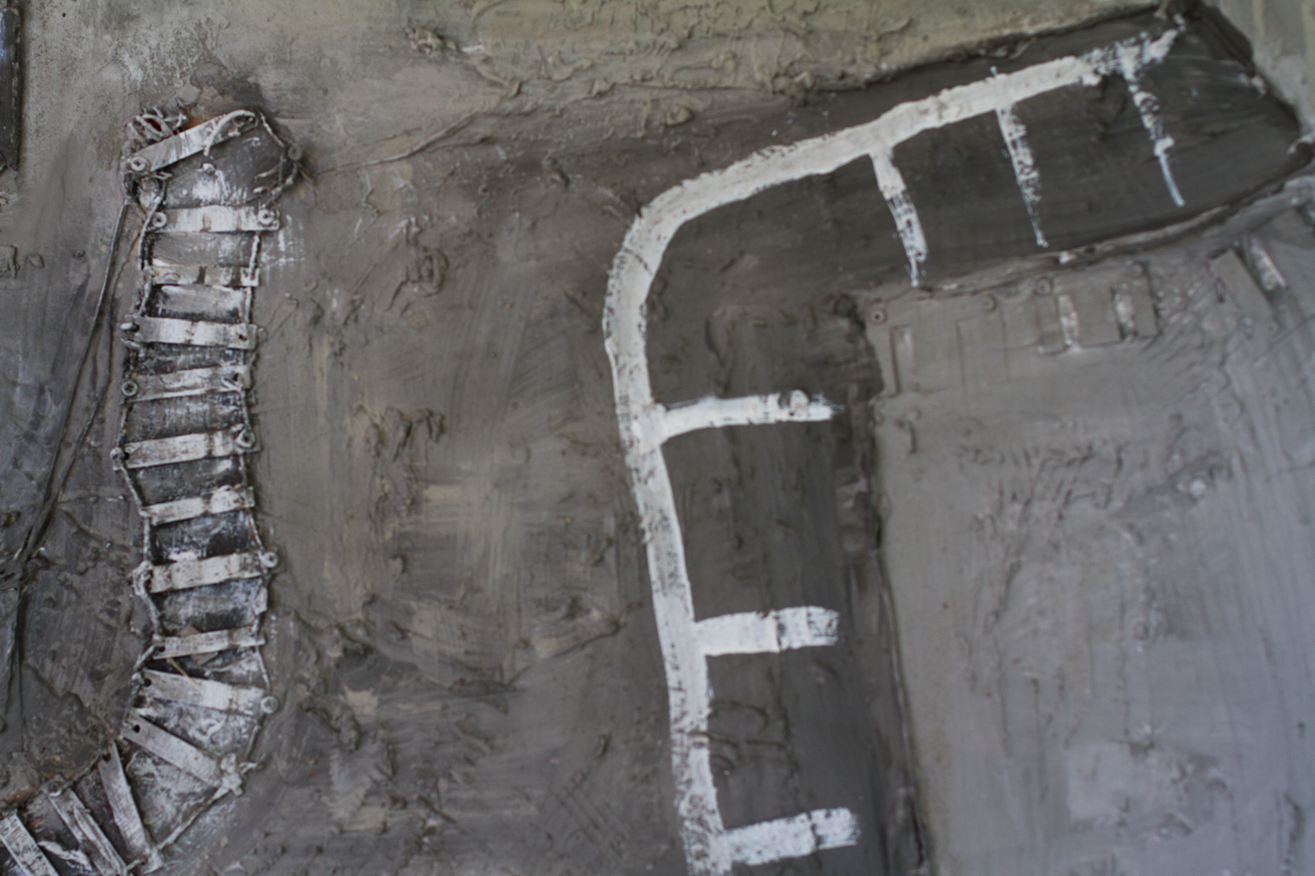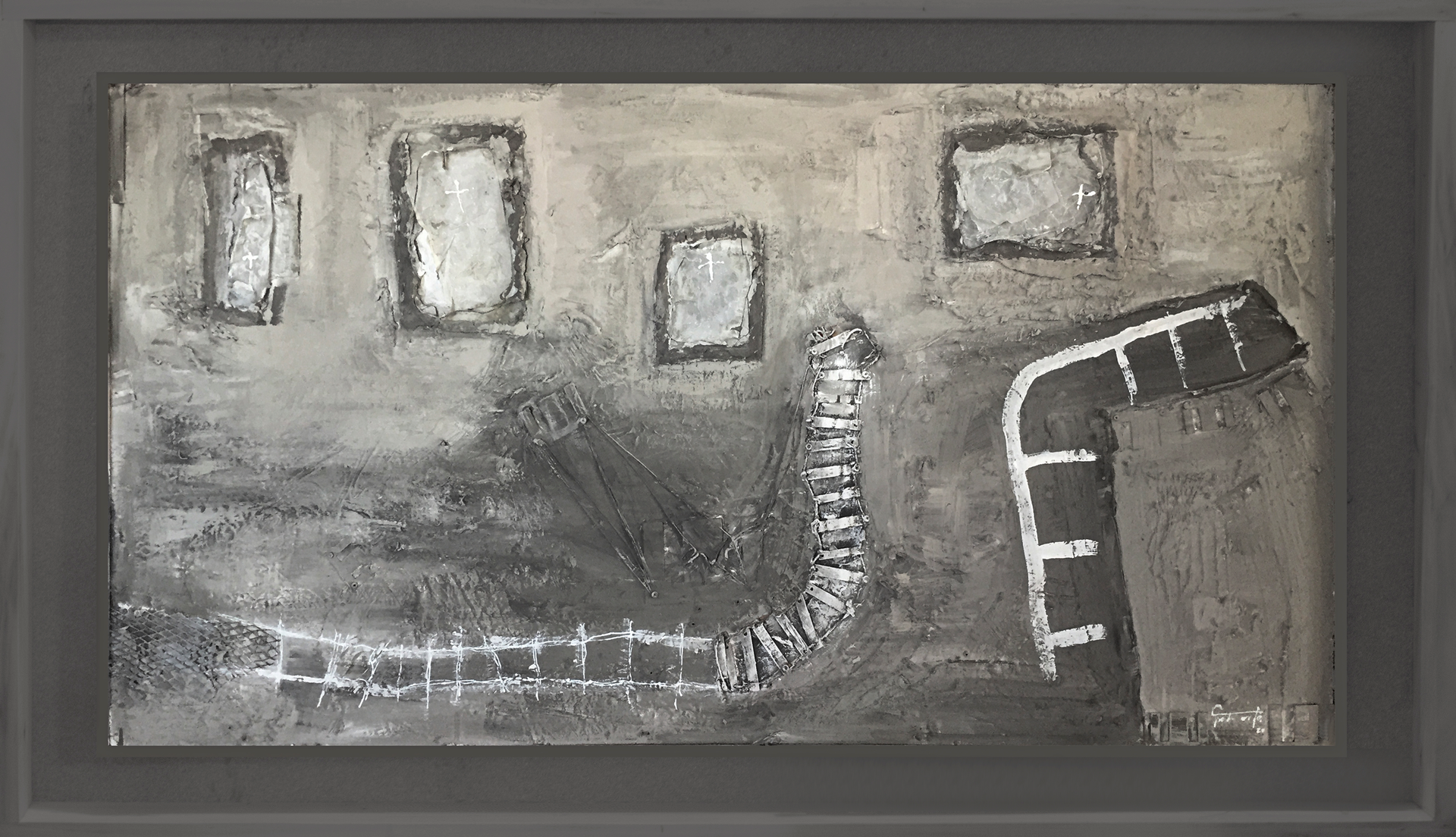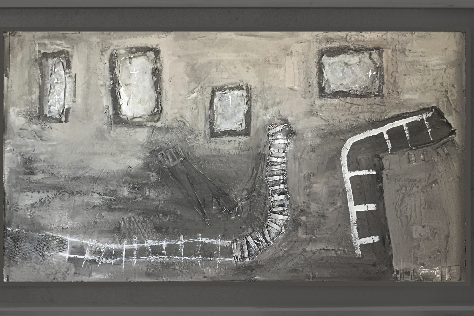 Auschwitz representa un paisaje desolador que bien podría ser una toma aérea de un campo de concentración. Un vía abandonada y sin dirección junto a distintas fosas con cruces. No deja de ser una pintura abstracta que cada uno interpretará libremente.