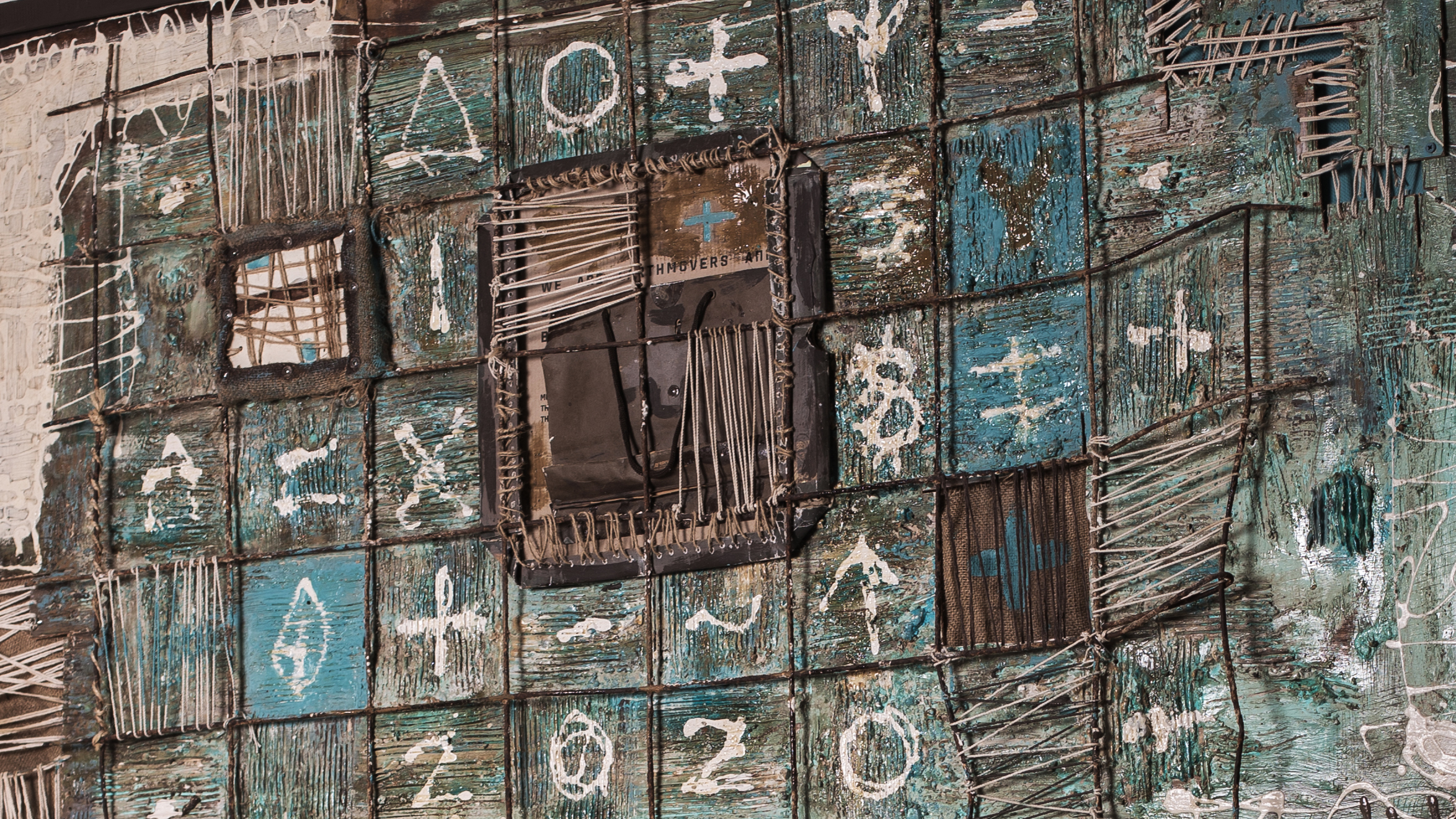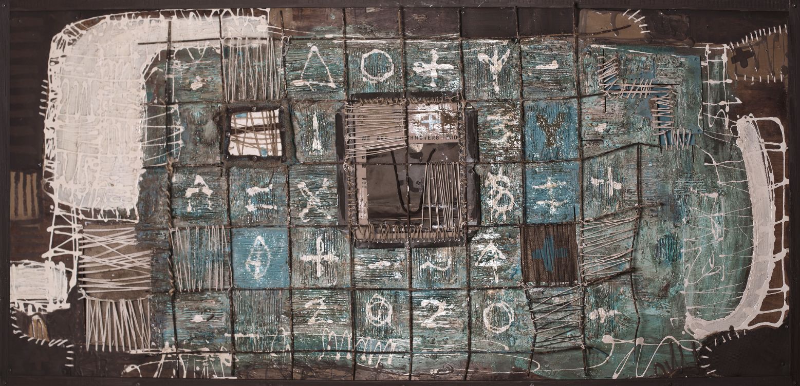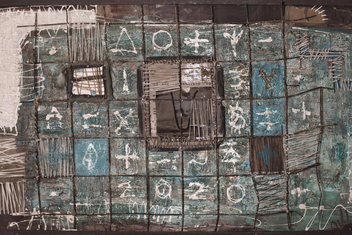 Encierros surge en la pandemia, en condiciones de aislamiento y encierro. Una malla de hierro configura distintas celdas con símbolos y números.