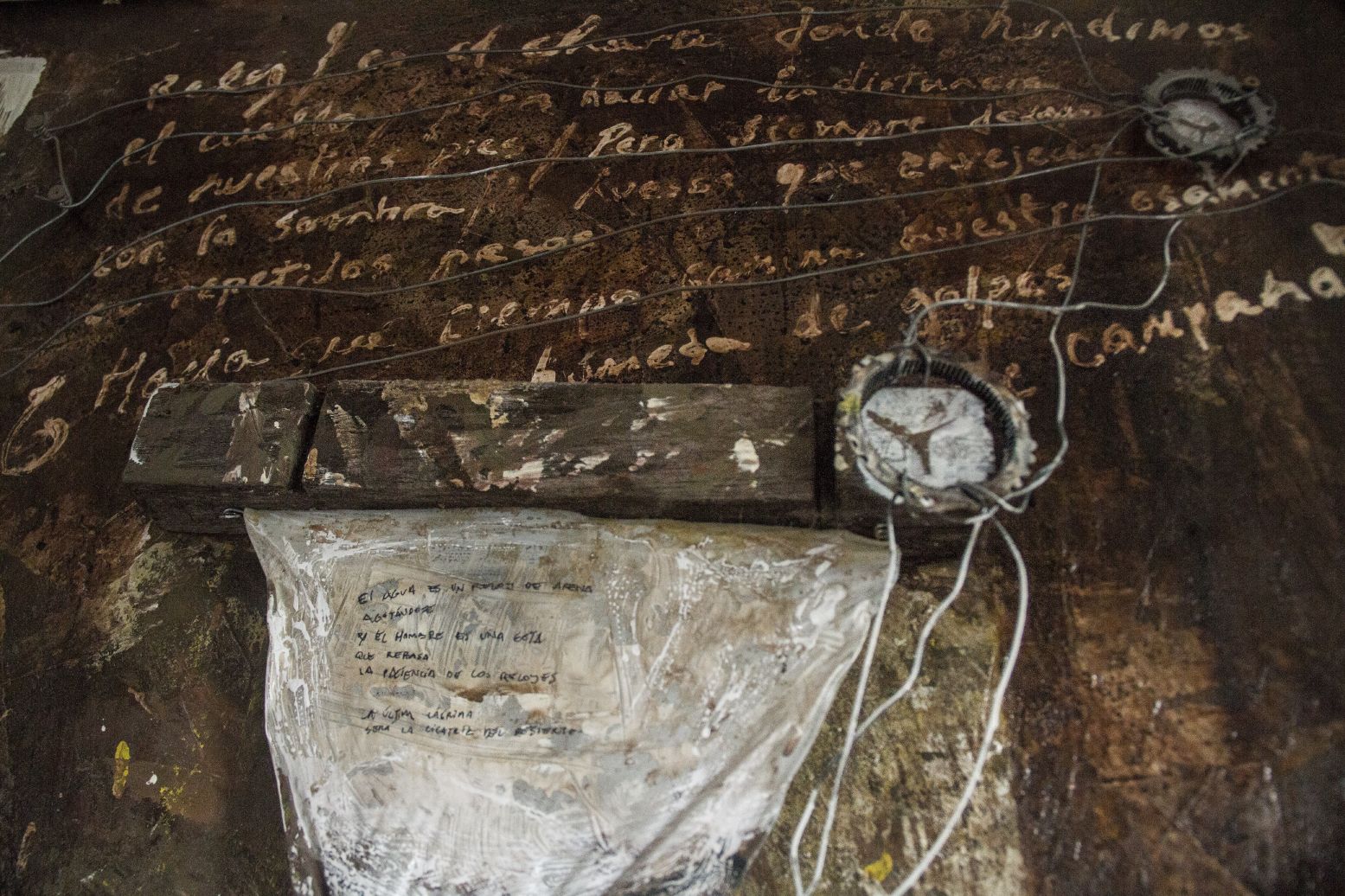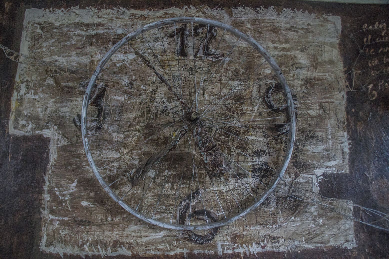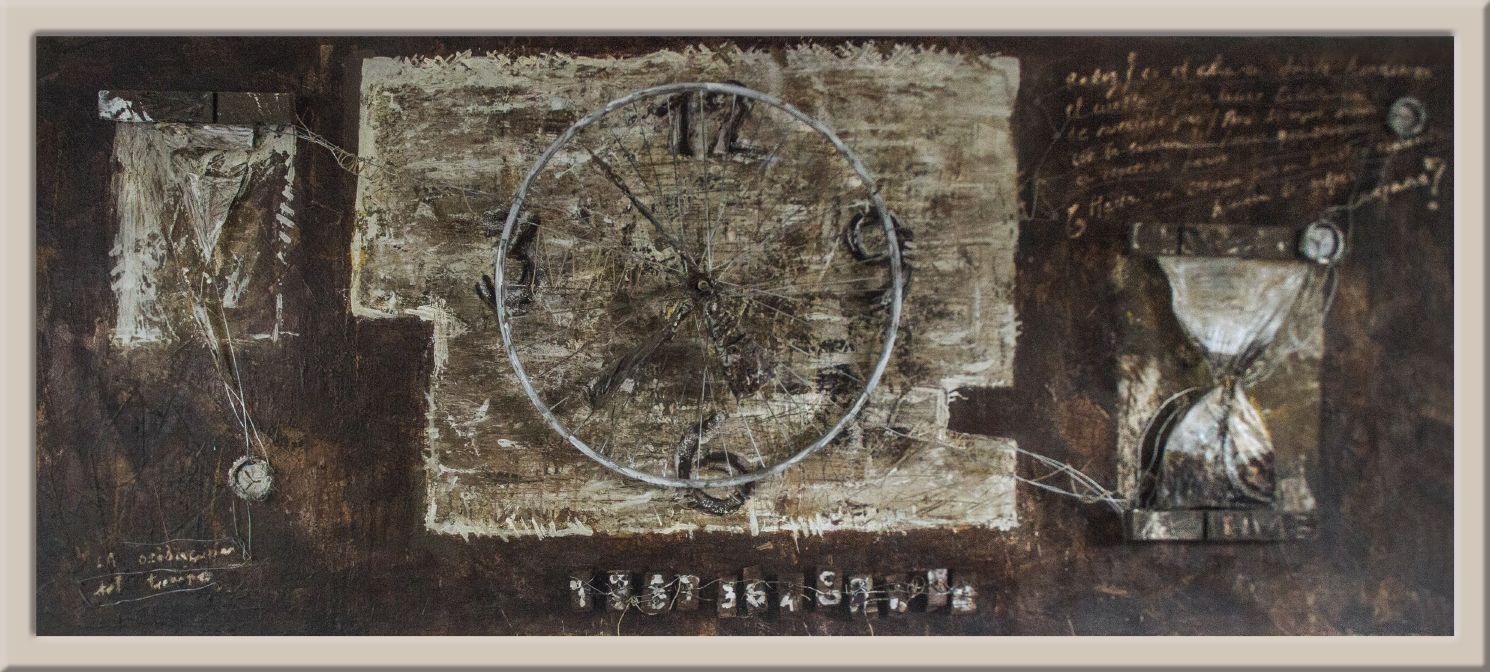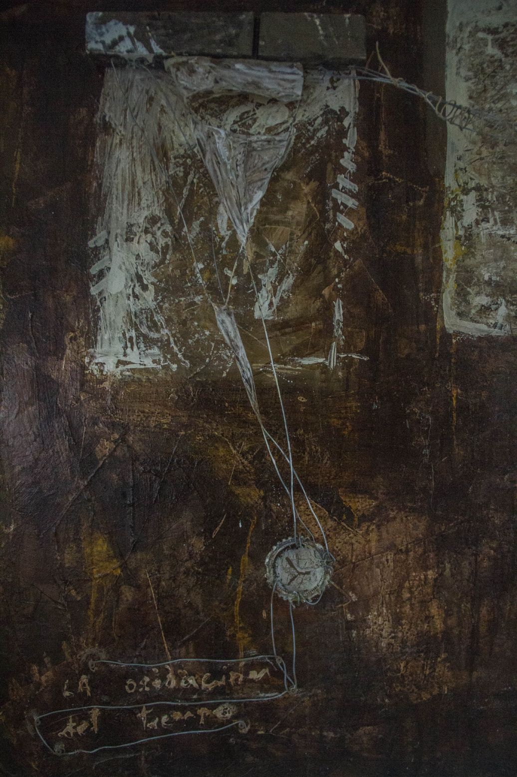 Una suerte de reloj en una celda blanca. Avanza como un rueda e irá oxidando con los años. Distintos relojes y versos descansan sobre esta madera que tendrá al tiempo como enemigo o aliado. Sólo él, el tiempo, lo sabrá.