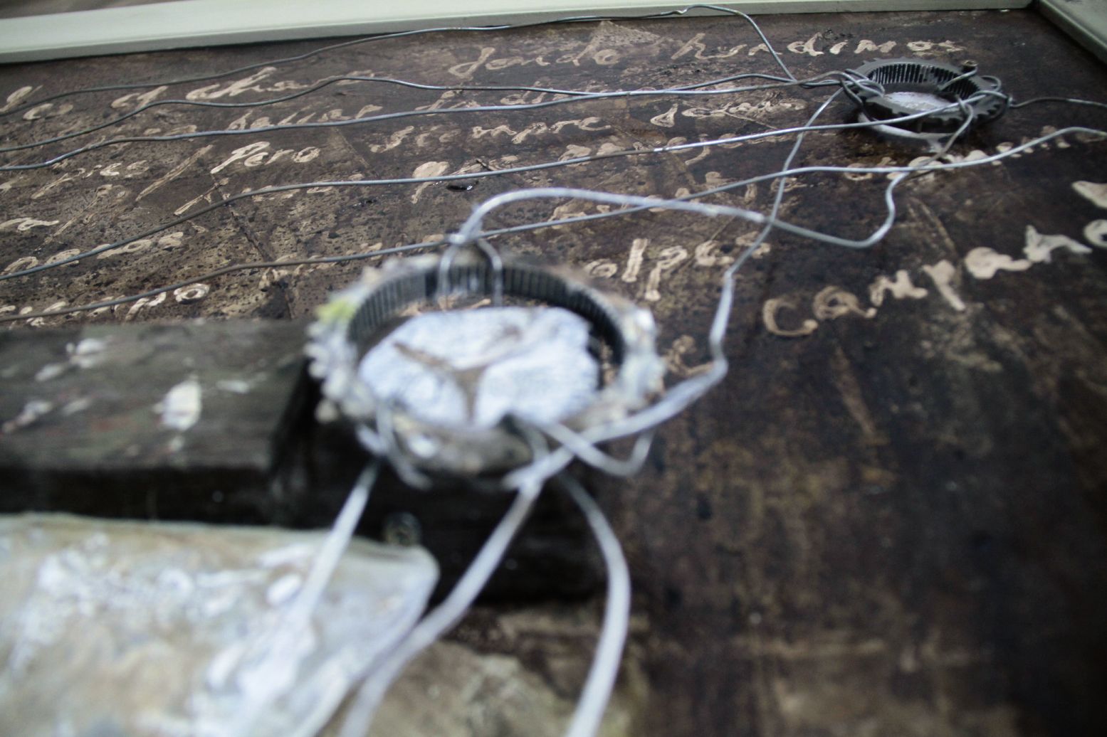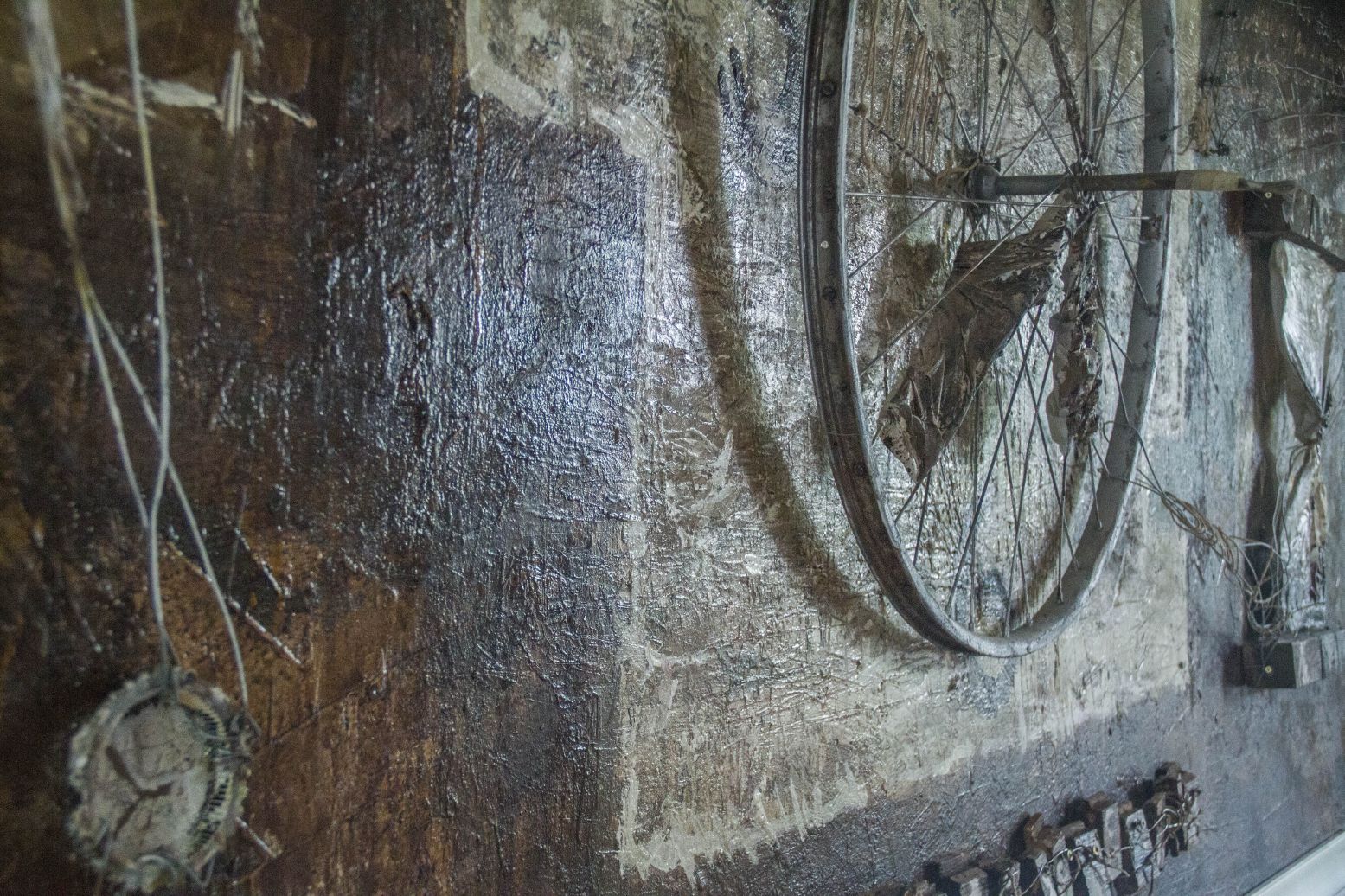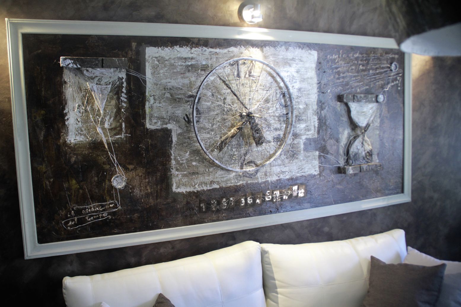 Una suerte de reloj en una celda blanca. Avanza como un rueda e irá oxidando con los años. Distintos relojes y versos descansan sobre esta madera que tendrá al tiempo como enemigo o aliado. Sólo él, el tiempo, lo sabrá.