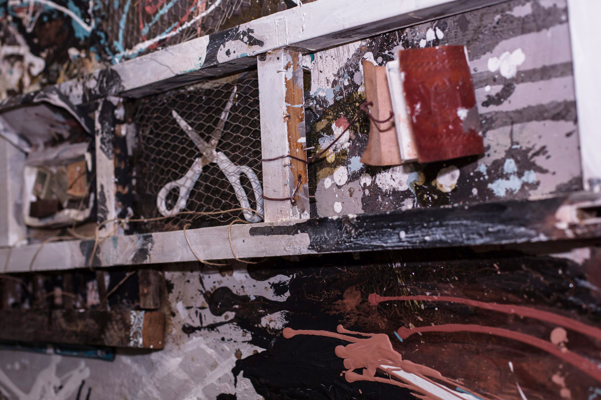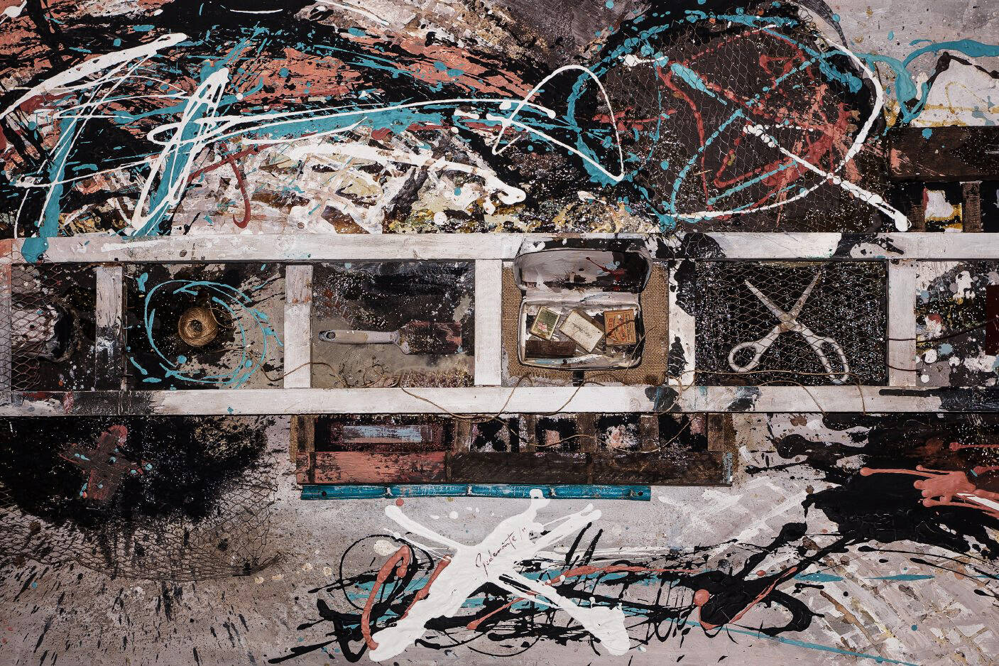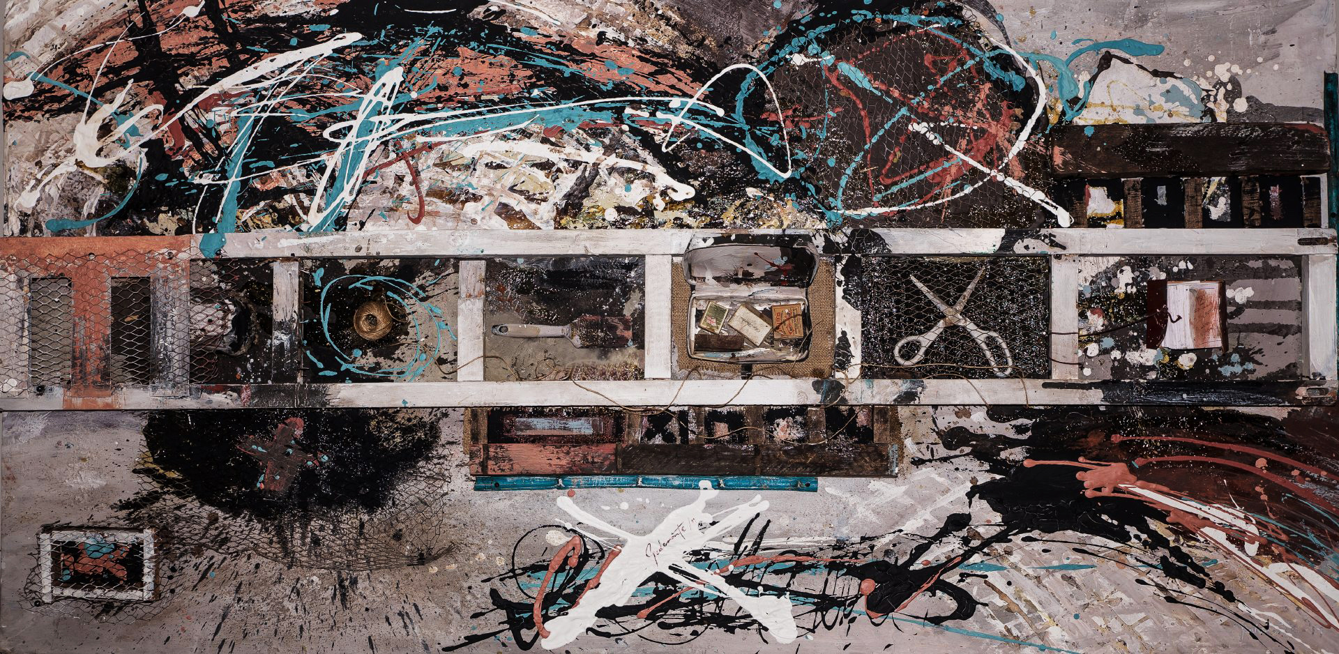 Osamenta Osamenta es mi esqueleto como pintor. Allí está casi todo lo que preciso para pintar y poder concebirme como artista una vez que pongo mi alma a trabajar con cuerdas, tijeras, rejillas y pinceles.Medidas100 x 200 cm Año2019 TécnicaMixta sobre chapa EstadoAdquirido