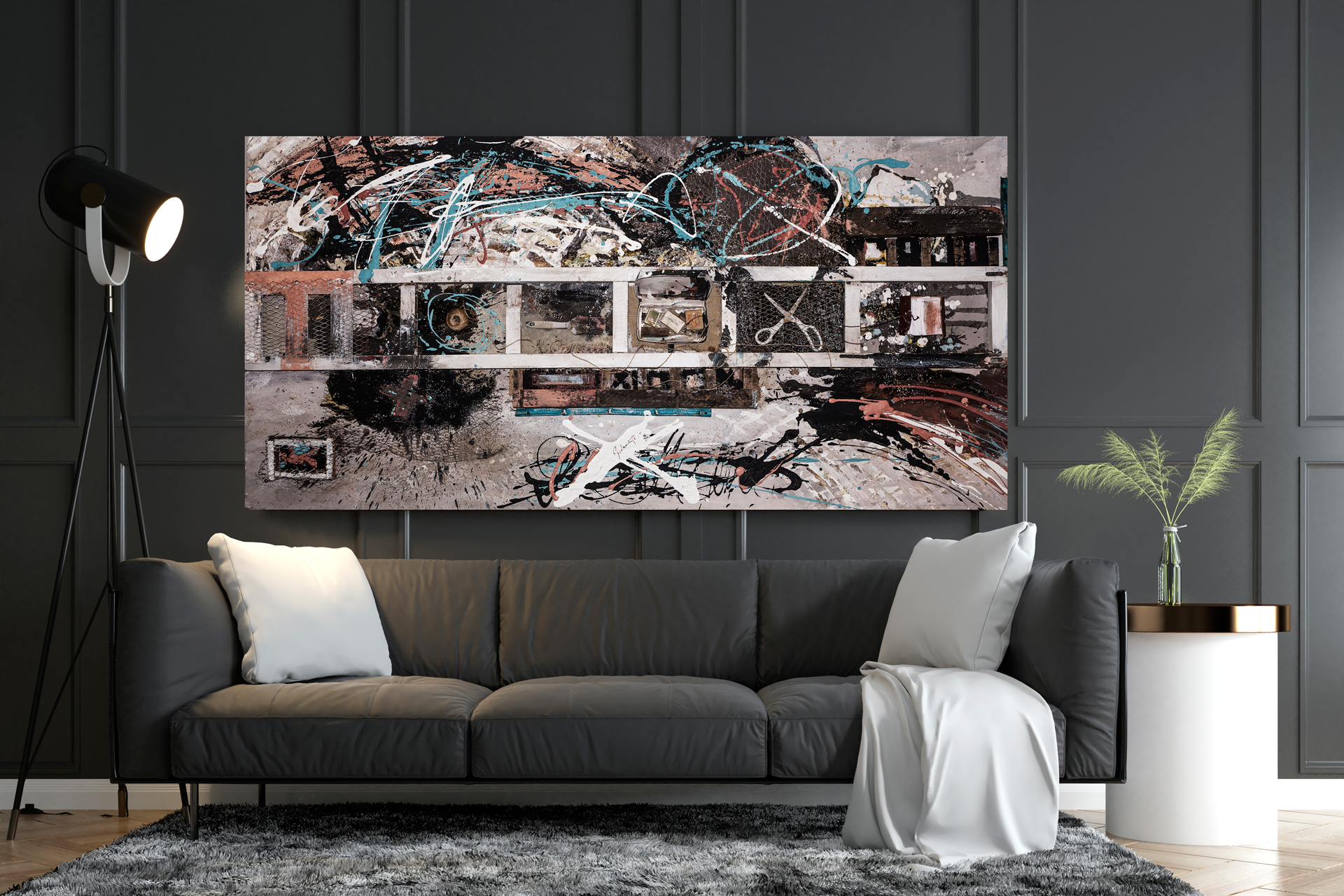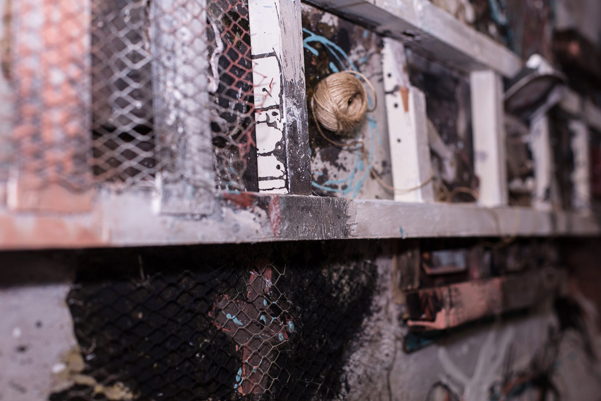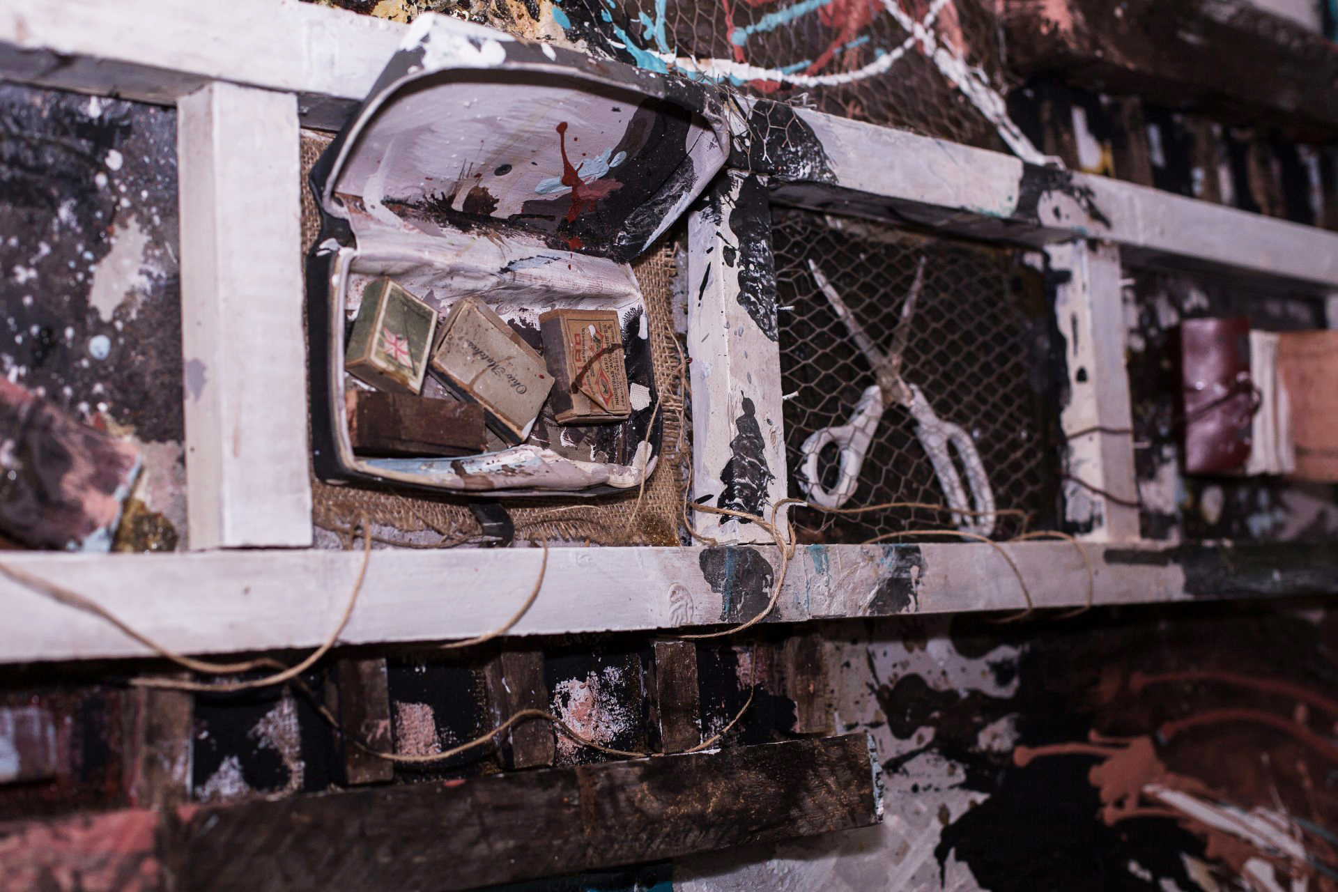Osamenta Osamenta es mi esqueleto como pintor. Allí está casi todo lo que preciso para pintar y poder concebirme como artista una vez que pongo mi alma a trabajar con cuerdas, tijeras, rejillas y pinceles.Medidas100 x 200 cm Año2019 TécnicaMixta sobre chapa EstadoAdquirido